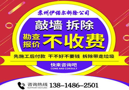 蘇州伊諾爾拆除工程有限公司是一家規模較大,經濟實力雄厚的專業拆除公司,提供室內拆除,砸墻,地磚,墻磚,頂,管道,公寓,酒店,辦公樓拆除服務,我們本著誠信經營,公平交易的原則,從事家裝,工裝,大型商場拆除,建筑物廠房樓房拆除工程并回收所有舊貨設備。我們從事拆除行業多年,具有多年的拆除經驗,提供多種建筑的內外拆除施工服務,因為專業性,安全性,可信度高而獲得了客戶的認可。